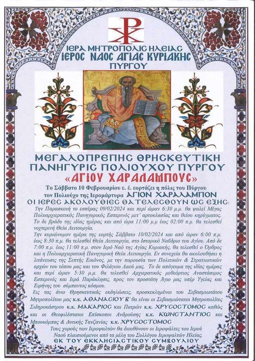 Πύργος: Πρόγραμμα εορτασμού του Πολιούχου Αγίου Χαραλάμπους την Παρασκευή 9/2 και το Σάββατο 10/2