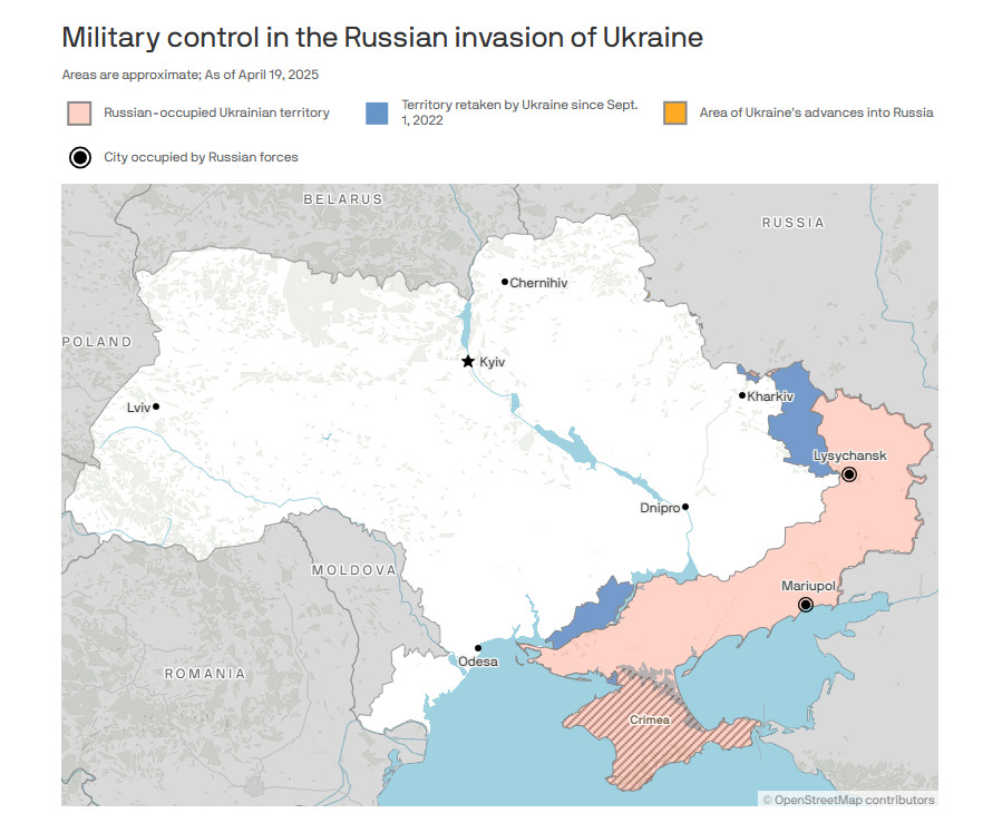 Με το ροζ χρώμα τα εδάφη που κατέχει η Ρωσία από την εισβολή του 2022, Πηγή: Axios