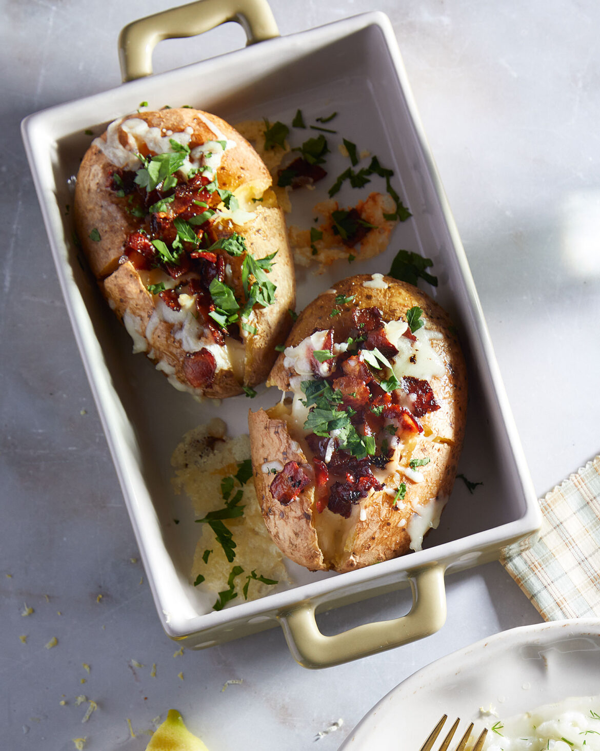 - Για τις ολόκληρες φουρνιστές πατάτες με μπέικον και κασέρι (jacket potatoes), σε ένα μπολάκι ανακατεύουμε το βούτυρο με το μπέικον, το κασέρι και αλατοπίπερο.