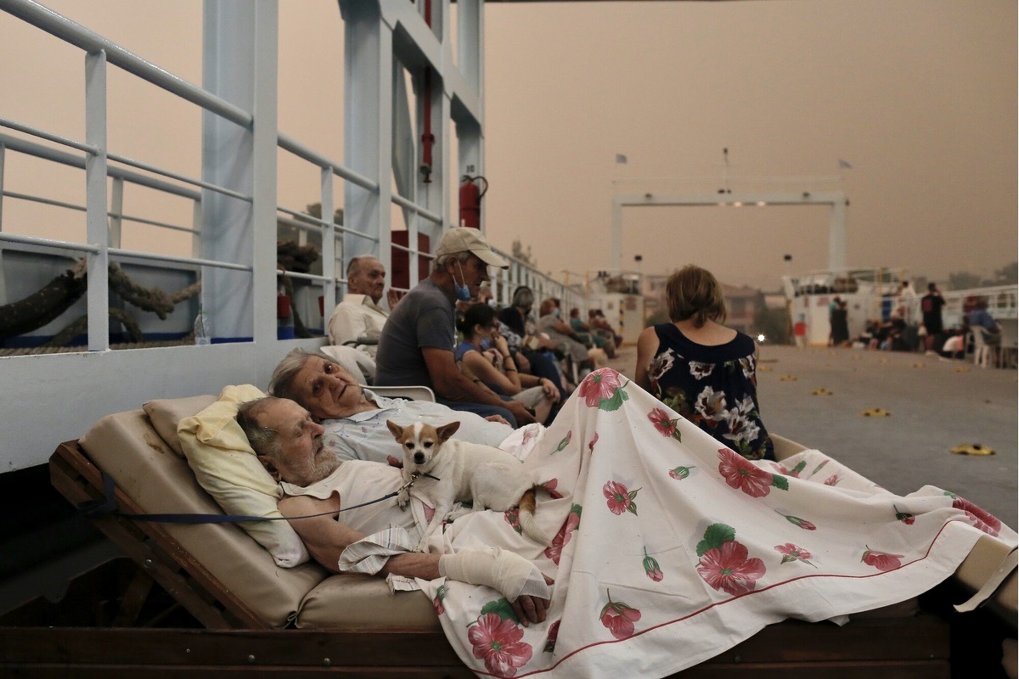 Ο Γεώργιος Λιάκος 89 ετών και η σύζυγός του Παρισσώ Λιάκου 87 ετών, κάτοικοι του χωριού Πευκί, μαζί με το σκυλάκι τους Bella, στο κατάστρωμα φέρι μποτ το οποίο βρίσκεται σε αναμονή στην παραλία του χωριού για να συνδράμει στην εκκένωση του χωριού κατά τη διάρκεια δασικής πυρκαγιάς στην Βόρεια Εύβοια, Κυριακή 08 Αυγούστου 2021.