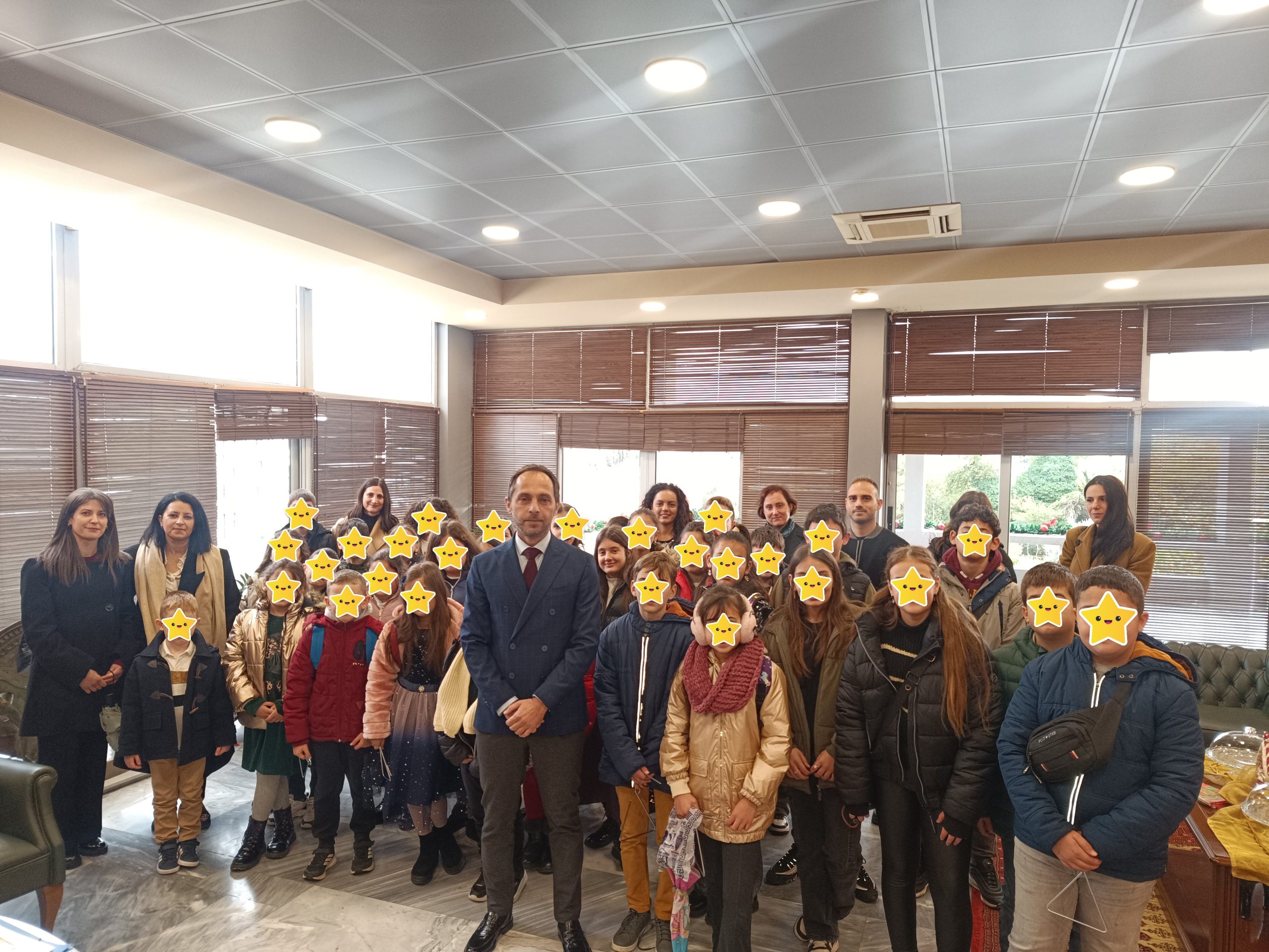Συνοδευόμενοι από την Διευθύντρια του Δημοτικού Σχολείου, Βασιλική Σαραντοπούλου, τους δασκάλους τους, Τασία Τζαβάρα, Κωνσταντίνα Γαλανοπούλου, Παρασκευή Μίχου, Αγγελική Αθανασοπούλου, Αγγελική Δημοπούλου, Ηλία Βαχλιώτη και τη σχολική νοσηλεύτρια, Παναγιώτα Τόκα, μετά τον εκκλησιασμό του σχολείου τους, ήρθαν στο Δημαρχείο, όπου συναντήθηκαν με τον Δήμαρχο, τραγούδησαν υπό τις οδηγίες της εκπαιδευτικού Μουσικής, Άννας Σταματάκη, και αντάλλαξαν ευχές,