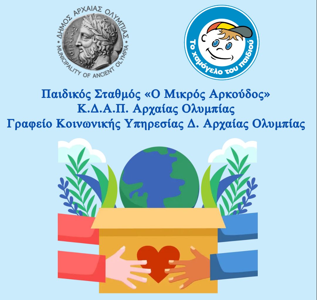 Με πρωτοβουλία της Αντιδημάρχου Πολιτιστικών Δράσεων Κοινωνικής Αλληλεγγύης, Αθηνάς Ηλιοπούλου, ο Δήμος, οι Κοινωνικές Υπηρεσίες, το Κέντρο Κοινότητας, ο Παιδικός Σταθμός «Μικρός Αρκούδος» και το Κ.Δ.Α.Π. Αρχαίας Ολυμπίας, σε συνεργασία με το Χαμόγελο του Παιδιού, συγκεντρώνουν ρούχα, παιχνίδια και είδη πρώτης ανάγκης για τα παιδιά που φιλοξενούνται στις Δομές του Χαμόγελου του Παιδιού.
