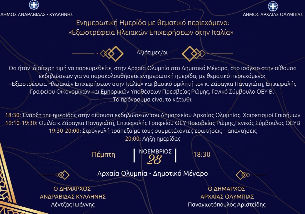 κατοίκους της Ηλείας στο ισόγειο του Δημαρχείου Αρχαίας Ολυμπίας την Πέμπτη 28/11/2024 στις 18:30 το απόγευμα να παραβρεθούν στην ενημερωτική ημερίδα, με θεματικό περιεχόμενο: «Εξωστρέφεια Ηλειακών Επιχειρήσεων στην Ιταλία» και βασικό ομιλητή τον κ. Ζάραγκα Παναγιώτη, Επικεφαλής Γραφείου Οικονομικών και Εμπορικών Υποθέσεων Πρεσβείας Ρώμης, Γενικό Σύμβουλο ΟΕΥ Β΄.