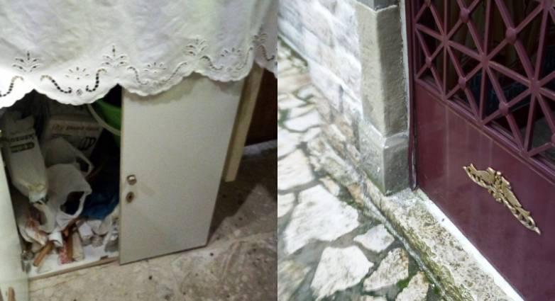 Η κεντρική πόρτα ήταν παραβιασμένη ενώ υπήρχε μία μεγάλη τρύπα στο σημείο της σχισμής στο ξύλινο παγκάρι.