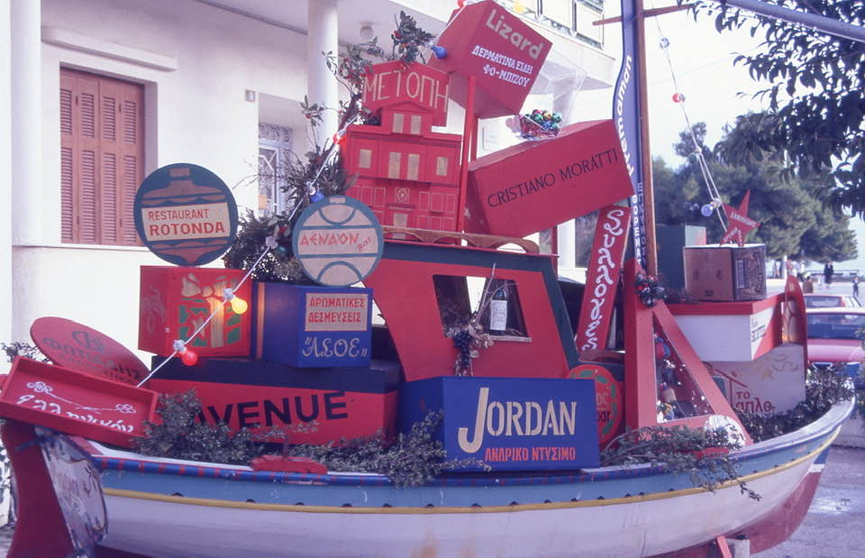 Χριστούγεννα γύρω στο ‘90 θα γιόρταζα τα γενέθλια μου με μια επέτειο για τα δέκα χρονια δουλειάς μου και στόλισα μια βάρκα με τις δουλειές μου για να υπαρχει στον δρόμο μπροστά από το γραφείο μου που τότε είχα στην οδό Ερμού στο διατηρητέο κτήριο με τα πέντε ζωγραφιστα ταβάνια.