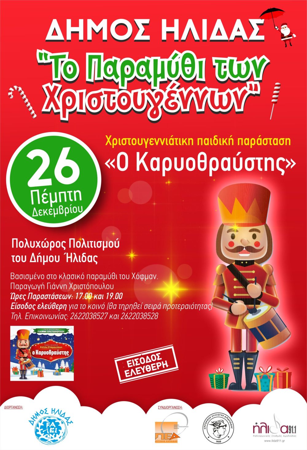 Ο Δήμος Ήλιδας στο πλαίσιο των Χριστουγεννιάτικων εορτών «Το Παραμύθι των Χριστουγέννων, προσφέρει για όλους τους μικρούς φίλους της ευρύτερης περιοχής, την παιδική παράσταση «Ο Καρυοθραύστης» βασισμένη στο κλασικό παραμύθι του Χόφμαν, σε παραγωγή Γιάννη Χριστόπουλου.