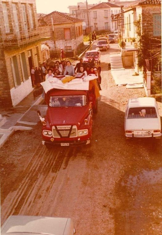 Ακολουθούσε ένα μικρό γλέντι και με χαρά και δάκρυα συγκίνησης φόρτωναν τα προικιά παλιά σε αλογομούλαρα,αργότερα σε φορτηγά, με τρόπο τέτοιο να φαίνονται , για να φανεί η αξιοσύνη και η νοικοκυροσύνη της νύφης.