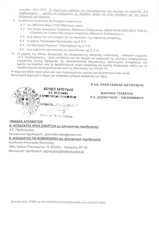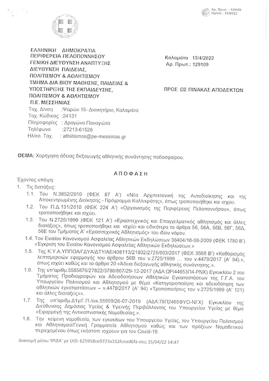 Επειδή από την πρώτη ήδη ματιά υπήρχαν βασιμότατες ενδείξεις ότι κάτι δεν …πήγαινε καλά με το έγγραφο αυτό, χθες Δευτέρα αρχικά είχα άμεση συνεργασία με τους διοικούντες του Πανηλειακού και αμέσως μίλησα τόσο με τη Διεύθυνση Πολιτισμού κι Αθλητισμού της Περιφέρειας Πελοποννήσου όσο και με την αρμόδια διευθύντρια στην Π.Ε. Μεσσηνίας στην Καλαμάτα, ενώ το πρωί της Τρίτης όπως αρμοδίως είχε ζητηθεί κι εγγράφως, μας στάλθηκε το γνήσιο έγγραφο με τον συγκεκριμένο αριθμό πρωτοκόλλου. Το οποίο αποδεικνύεται πως είχε εκδοθεί στις 15 Απριλίου 2022 και ήταν για άλλον αγώνα, συγκεκριμένα τον αγώνα Πανθουριακός – ΑΟ Κυπαρισσίας στο γήπεδο Μικρομάνης, για το Σάββατο 16 Απριλίου 2022, στα πλαίσια του τοπικού πρωταθλήματος Μεσσηνίας!
