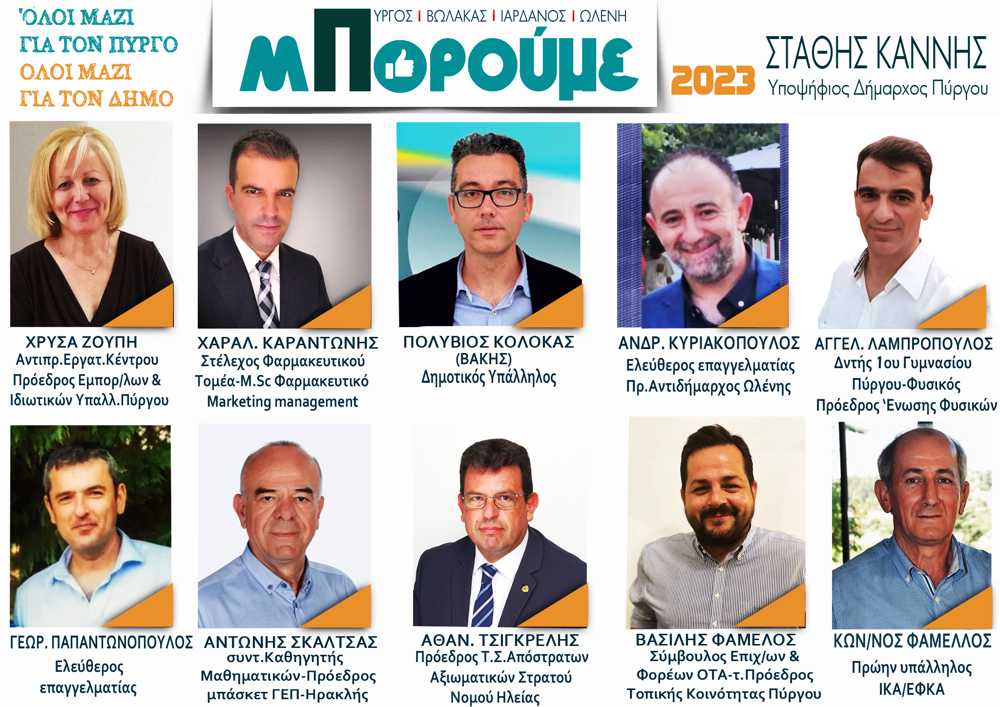 H δημοτική παράταξη «ΜΠΟΡΟΥΜΕ» με επικεφαλής και υποψήφιο Δήμαρχο Πύργου τον δικηγόρο Στάθη Καννή ανακοινώνει σήμερα δέκα ακόμα υποψηφίους δημοτικούς συμβούλους: