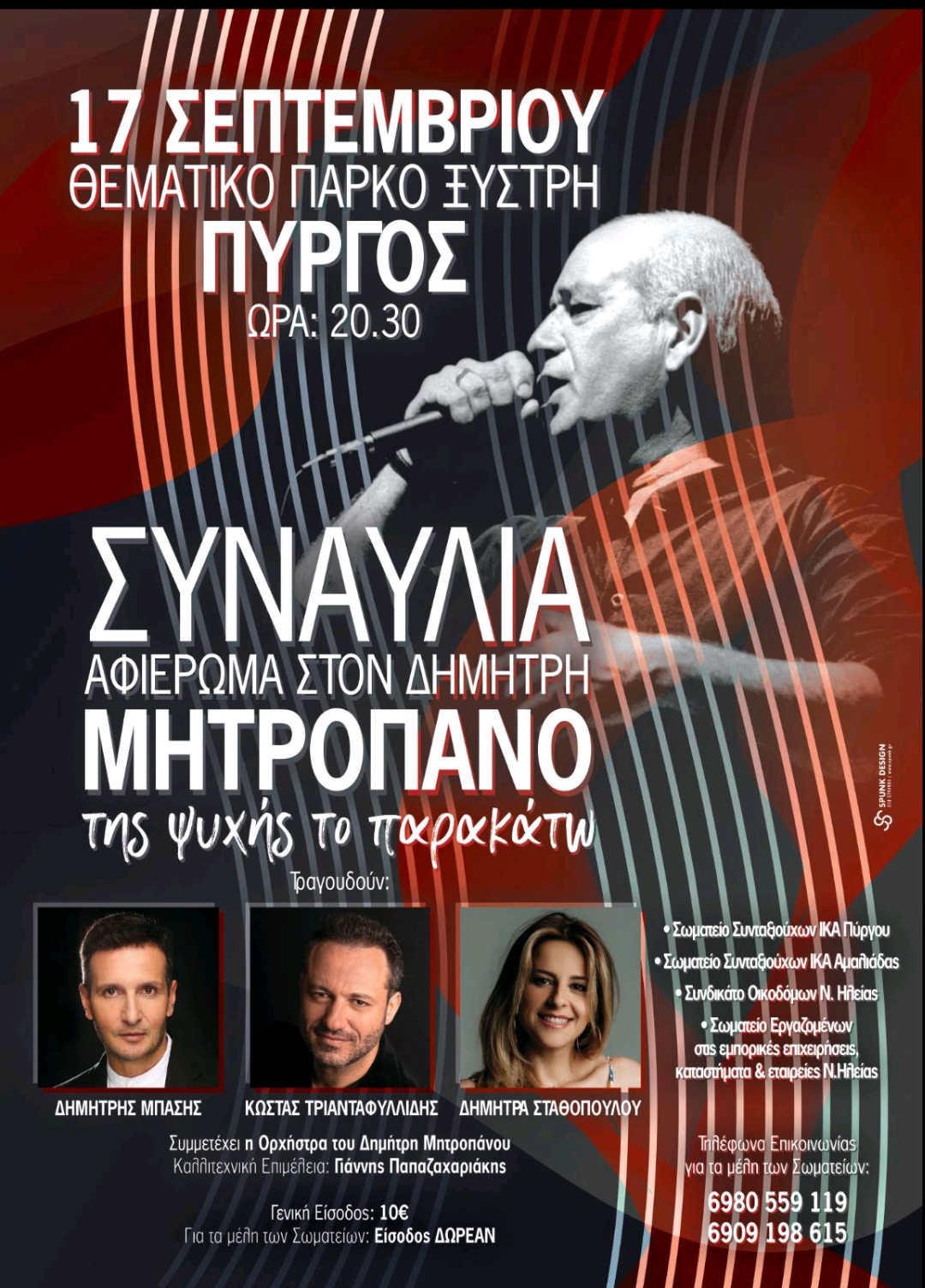 Τα σωματεία: Συνδικάτο Οικοδόμων Νομού Ηλεία, Σωματείο Ιδιωτικών Υπάλληλων Νομού Ηλείας, Σωματείο Συνταξιούχων ΙΚΑ Πύργου και Αμαλιάδας θα πραγματοποιήσουν συναυλία αφιέρωμα στον Δημήτρη Μητροπάνο με το Δημήτρη Μπάση και τον Κώστα Τριανταφυλλίδη.