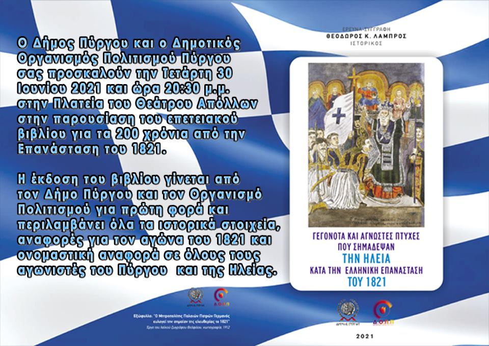 “Απόψε στις 8.30 στην πλατεία του Δημοτικού Θεάτρου “Απόλλων” έχουμε την τιμή να παρουσιάζουμε το ιστορικό βιβλίο του Δήμου Πύργου και του Δημοτικού Οργανισμού Πολιτισμού σε συγγραφή του ιστορικού, Θοδωρή Λάμπρου, αφιερωμένο στην Επανάσταση του 1821 στον Πύργο και την Ηλεία.