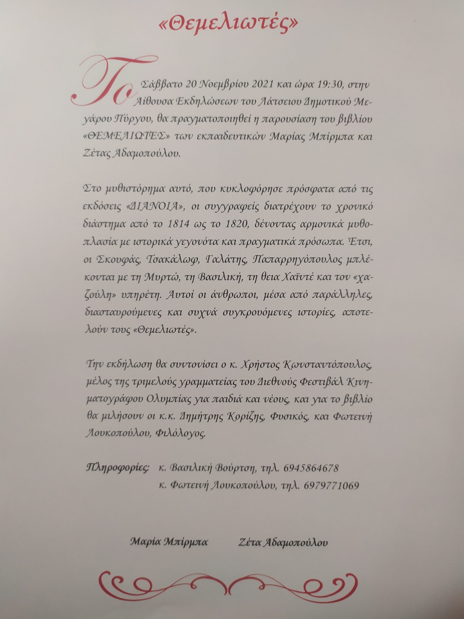 Παρουσίαση βιβλίου “Θεμελιωτες” της Μαρίας Μπίρμπα και της Ζέτα Αδαμοπούλου