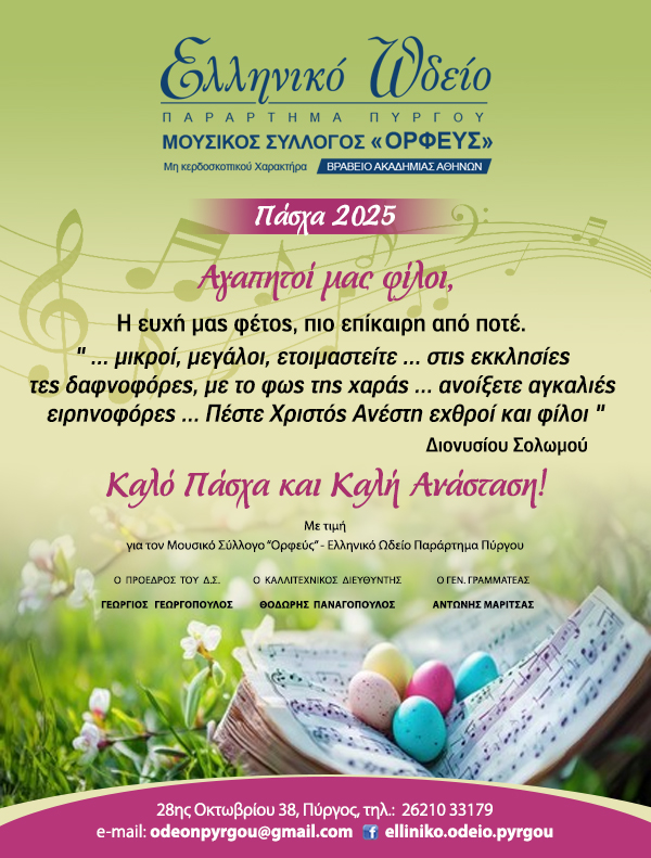 Πασχαλινές ευχές από το Ωδείο Πύργου