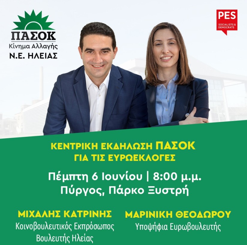 Την Πέμπτη 6/6 κι ενόψει των Ευρωεκλογών της Κυριακής, από το ΠΑΣΟΚ διοργανώνεται κεντρική προεκλογική εκδήλωση στον Πύργο (Πάρκο Ξυστρή, ώρα 8.00 μ.μ.), όπου κεντρικοί ομιλητές θα είναι ο Κοινοβουλευτικός Εκπρόσωπος του κόμματος και Βουλευτής Ηλείας Μιχάλης Κατρίνης και η υποψήφια Ευρωβουλευτής Μαρινίκη Θεοδώρου.