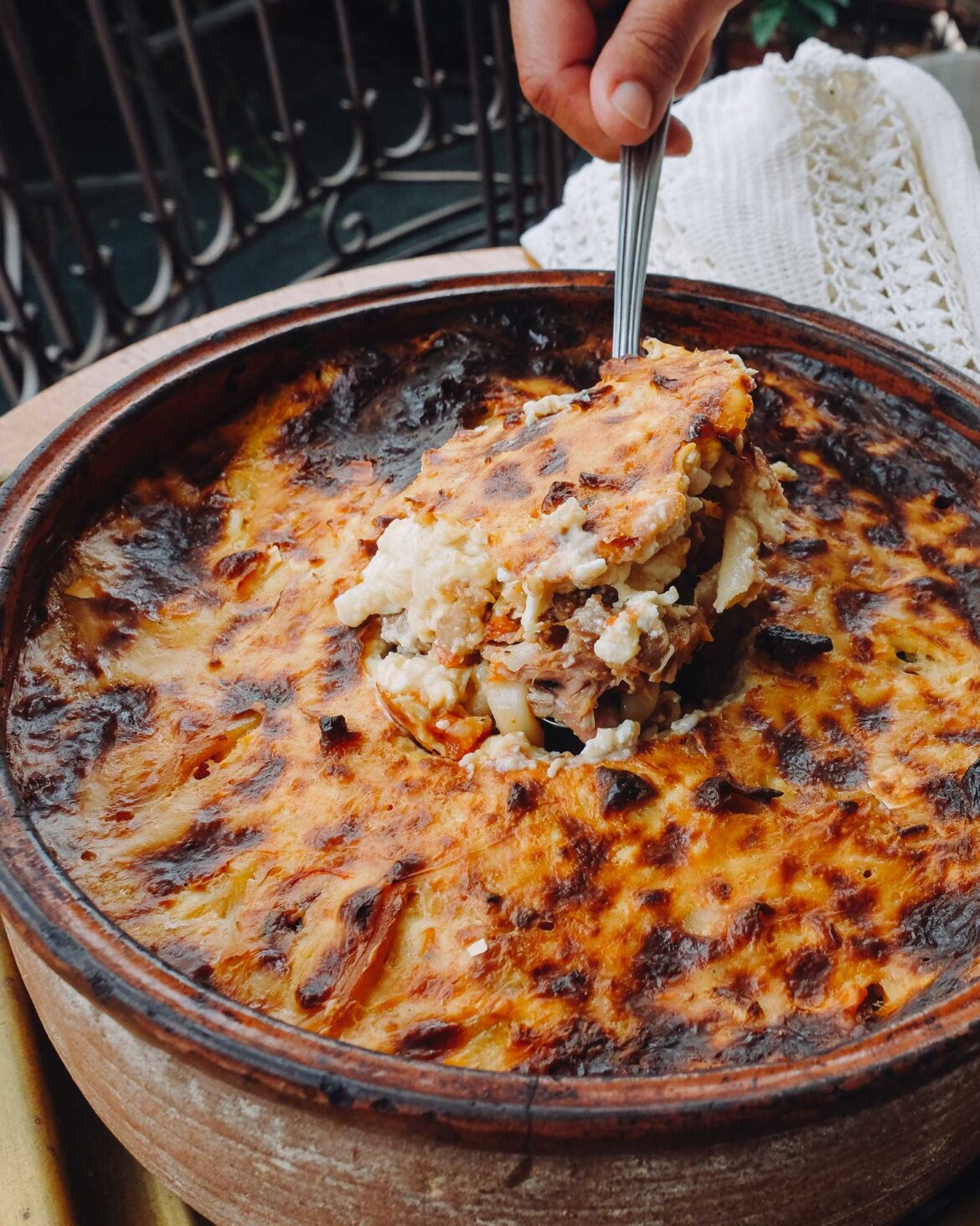 - Τέλος, περιχύνουμε ομοιόμορφα με την μπεσαμέλ.