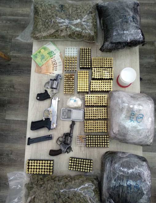Μετά από επιχείρηση του Τμήματος Δίωξης Ναρκωτικών της Ασφάλειας Πατρών, στην κατοχή τους βρέθηκαν 5 κιλά χασίς, 100 γραμμάρια κοκαΐνη, 2 περίστροφα και ένα πιστόλι ρέπλικα, 640 φυσίγγια και περίπου 200 γραμμάρια σκόνη νοθείας ουσιών.
