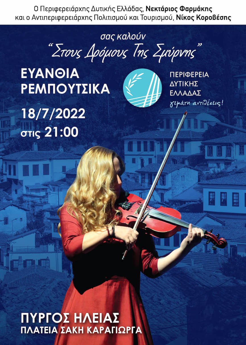 100 χρόνια από τη Μικρασιατική Καταστροφή η μοναδική και πολυβραβευμένη συνθέτης Ευανθία Ρεμπούτσικα με την Ορχήστρα Καμεράτα, μας ταξιδεύει «Στους Δρόμους της Σμύρνης», σε μια σπουδαία συναυλία- εκδήλωση μνήμης που διοργανώνει το τμήμα Πολιτισμού της Περιφέρειας Δυτικής Ελλάδας, την Δευτέρα 18 Ιουλίου, στις 9.00 το βράδυ, στην κεντρική πλατεία Πύργου.