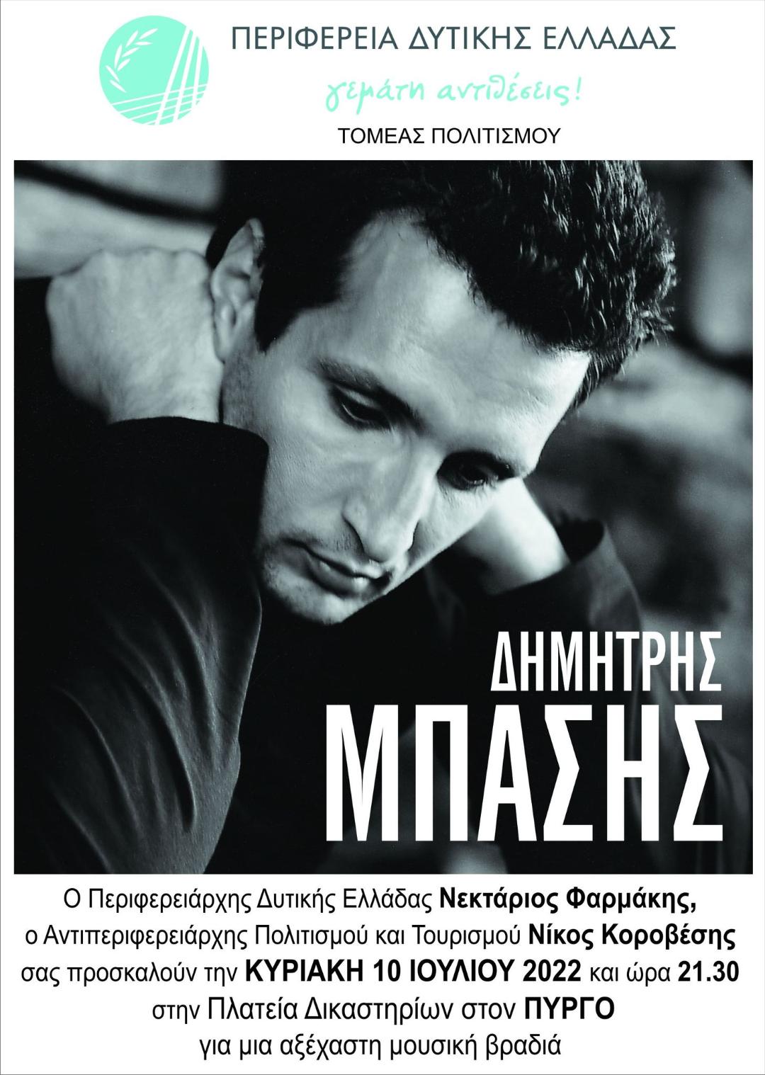 Μια ακόμα μοναδική συναυλία διοργανώνει το τμήμα Πολιτισμού της Περιφέρειας Δυτικής Ελλάδας στο πλαίσιο των φετινών εκδηλώσεων ΚΑΛΟΚΑΙΡΙ ΠΟΛΙΤΙΣΜΟΥ 2022, την Κυριακή 10 Ιουλίου στις 9.30 το βράδυ, όπου υποδέχεται με ελεύθερη όπως πάντα είσοδο στην πλατεία Δικαστηρίων τον αγαπημένο τραγουδιστή Δημήτρη Μπάση.