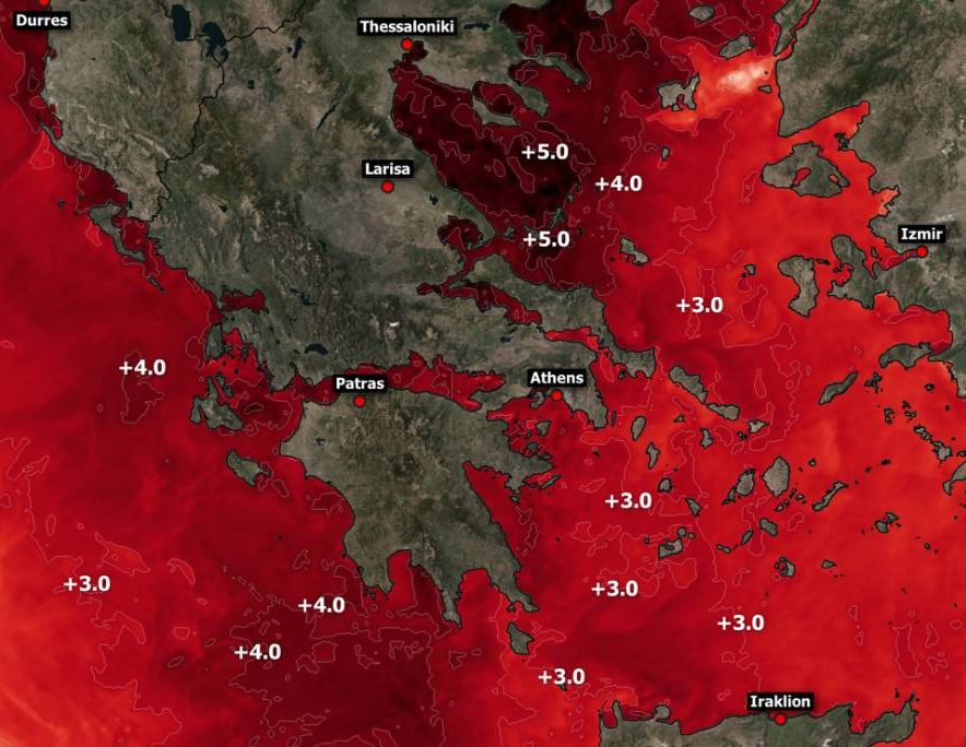 Ειδικότερα, όπως αναφέρει το climatebook.gr, στην Ανατολική Μεσόγειο η θερμοκρασία της θάλασσας βρίσκεται σε υψηλά επίπεδα για την εποχή με αποκλίσεις θερμοκρασίας της τάξεως των 2-3 ° C πάνω από τα κανονικά για την εποχή επίπεδα, ενώ οι μεγαλύτερες θετικές αποκλίσεις παρατηρούνται σε περιοχές του Αιγαίου πελάγους και στη θάλασσα του Λεβάντε.