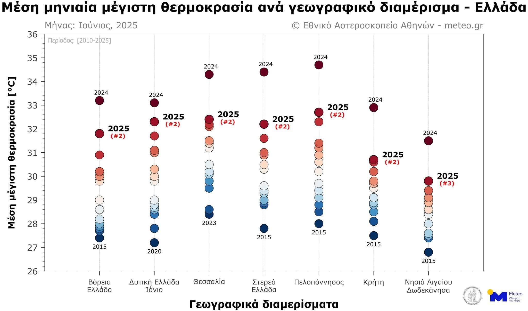 Σύμφωνα με το δίκτυο των 53 μετεωρολογικών σταθμών του Meteo Gr μέσω του Εθνικού Αστεροσκοπείου Αθηνών που λειτουργούν ανελλιπώς από το 2010 μέχρι σήμερα, τον Ιούνιο του 2025 η μέση τιμή των μεγίστων ημερήσιων θερμοκρασιών κυμάνθηκε πάνω από τα κανονικά για την εποχή επίπεδα σε όλες τις περιοχές της χώρας (σε σχέση με τον μέσο όρο της περιόδου 2010-2019).
