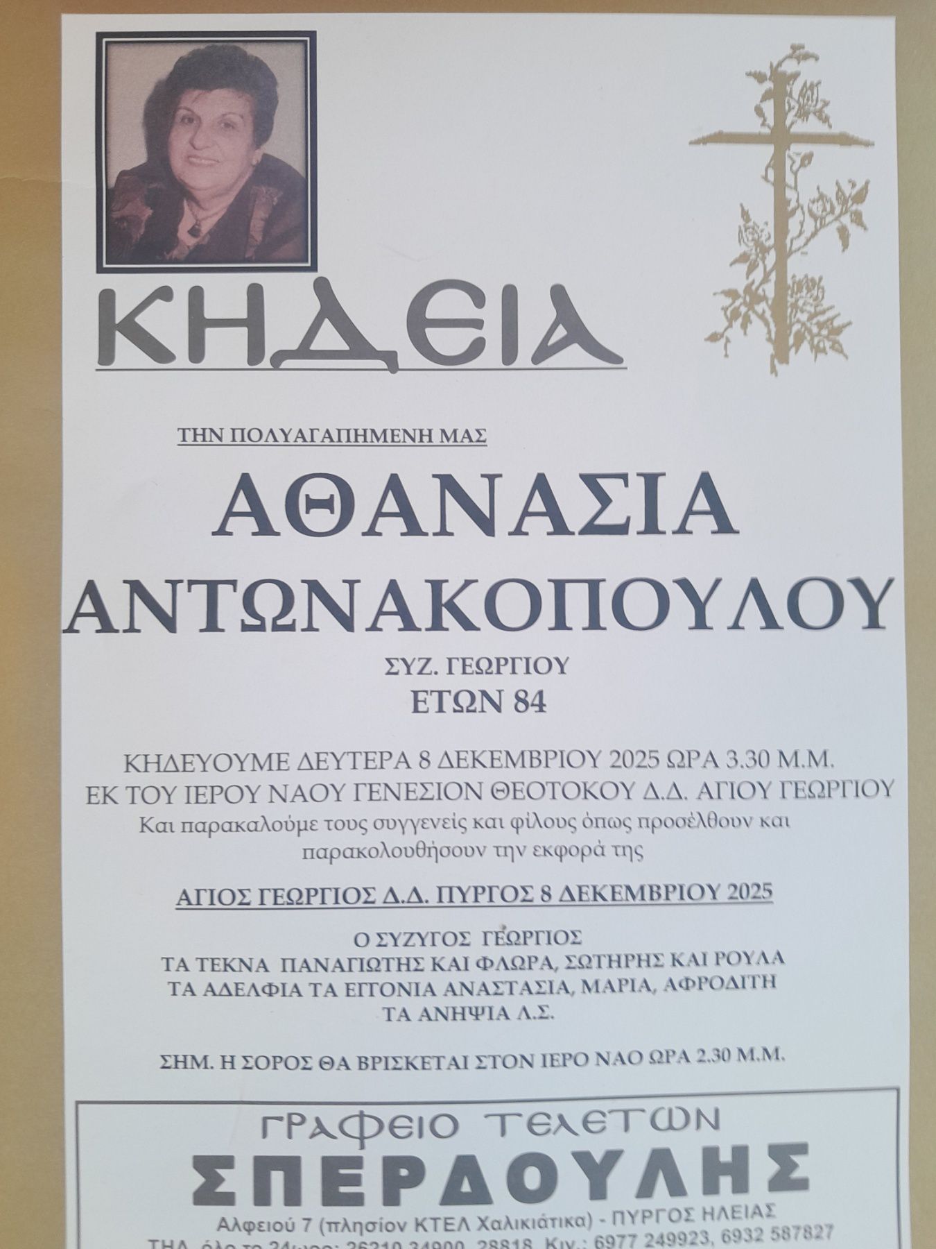 “Εφυγε πριν λιγο απο κοντα μας η μητερα μου Αντωνακοπουλου Αθανασια. Μια γυναικα ηρωιδα της καθημερινοτητας οπως οι περισσοτερες μητερες της δικης μας εποχης. Η ζωη της και ο αγωνας που εδωσε για τις αρχες της, σιγουρα την οδηγουν στην δεξια του Κυριου. Καλο ταξιδι στο αιωνιο φως αγαπημενη μου μανα.”