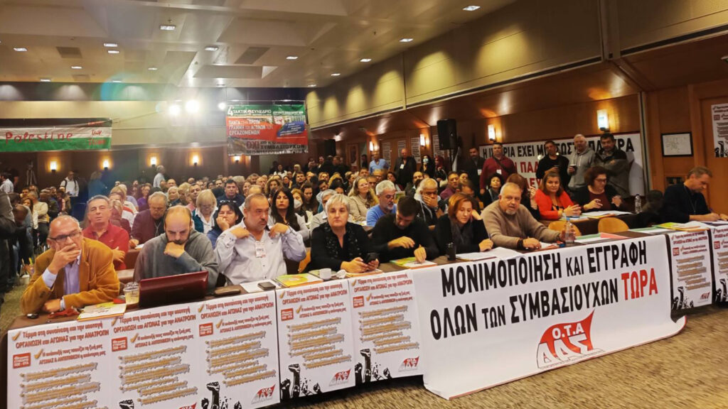 Ακόμα υπογράμμισε την ανάγκη να αναπτυχθούν και να οξυνθούν οι αγώνες του κλάδου για αυξήσεις στους μισθούς, επαναφορών των δώρων, για δραστική μείωση στα τιμολόγια του ρεύματος, στις τιμές των τροφίμων και των ειδών κατανάλωσης, να σταματήσει το αίσχος των πλειστηριασμών, να καταργηθεί η διάταξη Βορίδη και όλο το νομικό πλαίσιο που εμποδίζουν τη μονιμοποίηση των συμβασιούχων.