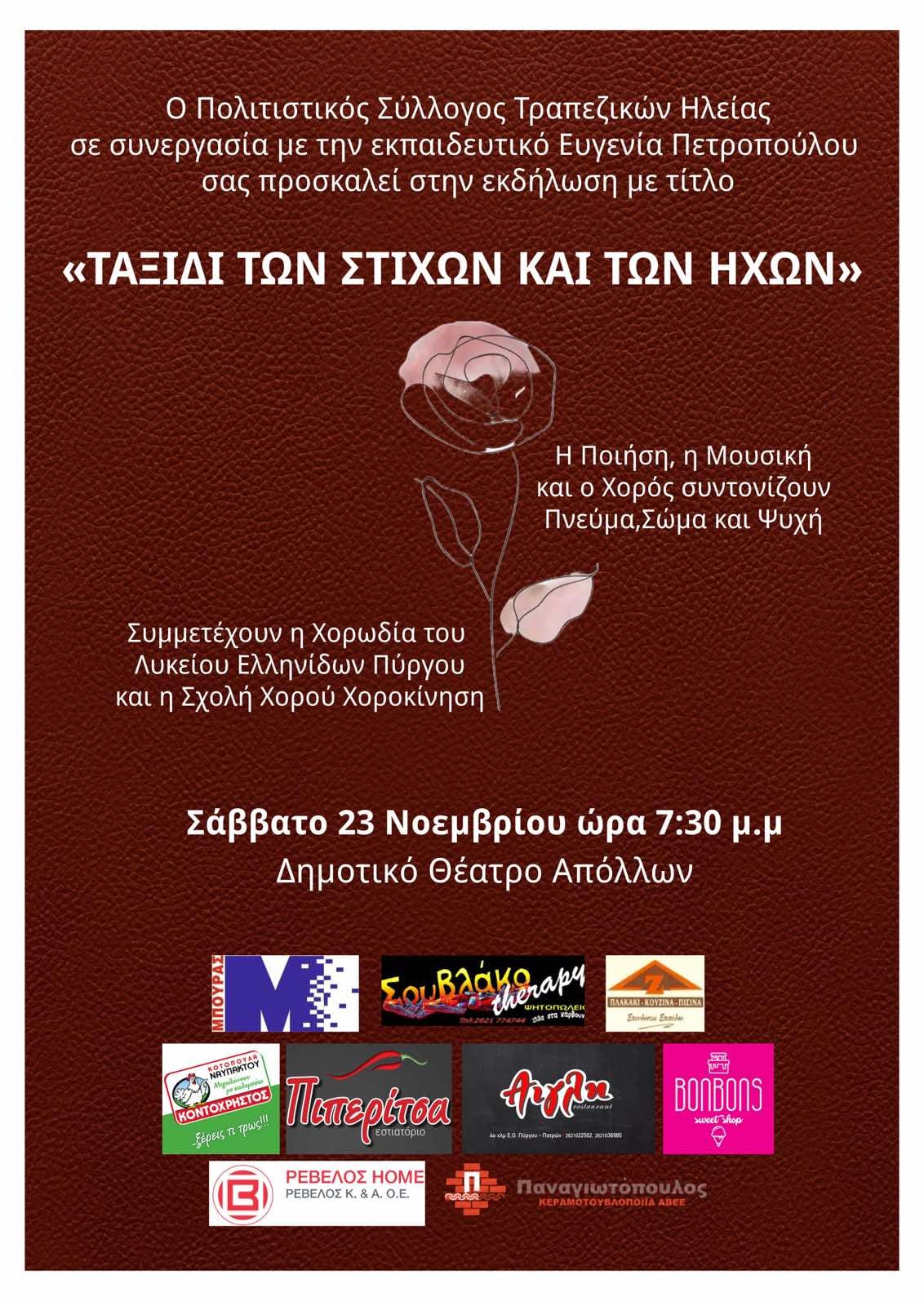 «Ταξίδι των στίχων και των ήχων» από τραγούδια σπουδαίων συνθετών, ποιήματα μεγάλων ποιητών και αφήγηση κειμένων (επιμέλεια της κας Ευγενίας Πετροπούλου).