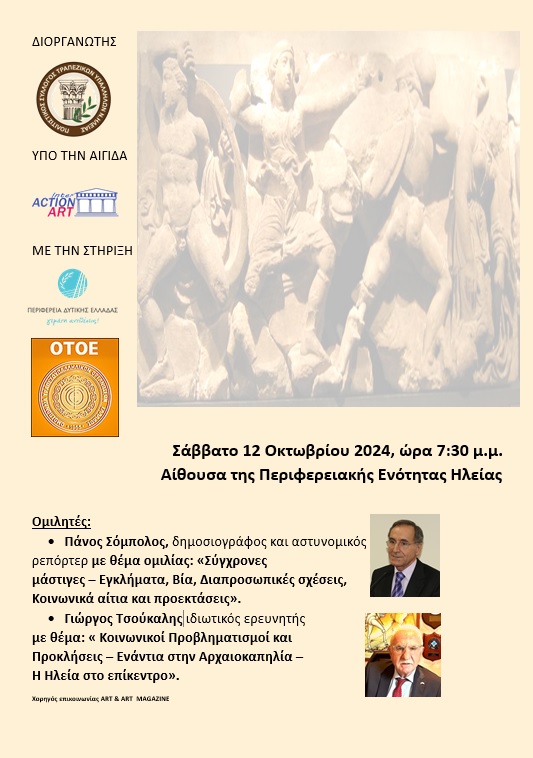 Θεμα της Ομιλίας του θα είναι ”Κοινωνικοί προβληματισμοί και Προσκλήσεις – Ενάντια στην Αρχαιοκαπηλία – Η Ηλεία στο επίκεντρο”