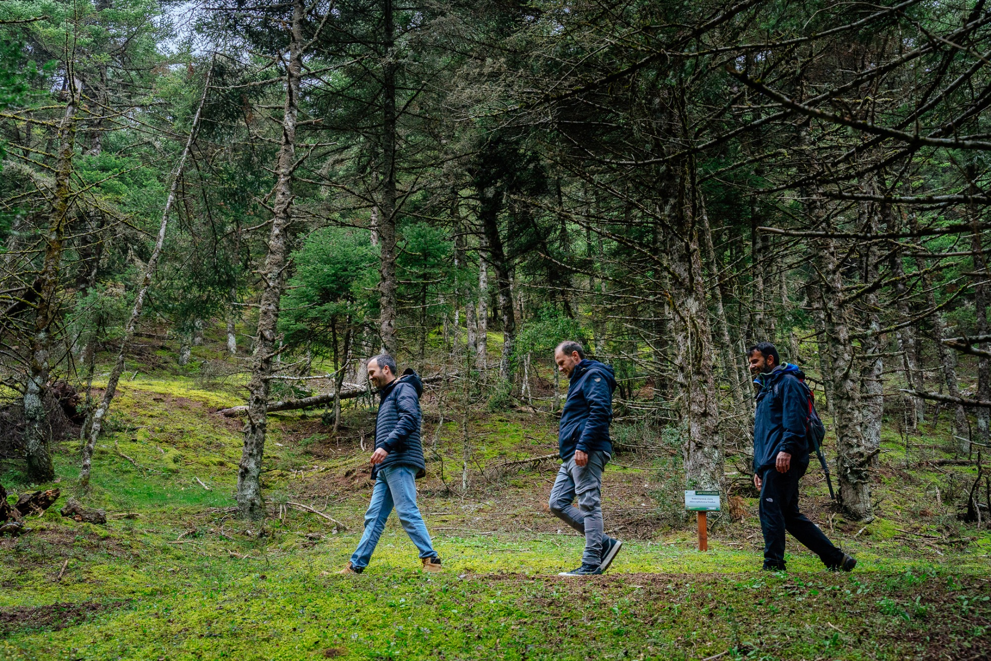 Ανεβαίνουμε το φιδωτό δρόμο μετά το μνημείο και ακριβώς 3,5 χλμ. μετά, παρκάρουμε δεξιά σε ένα πλάτωμα. Για να καταλάβουμε ακριβώς το σημείο, σημειώνουμε ότι αυτό βρίσκεται 850 μέτρα μετά το ξενοδοχείο Georgios V Chalet. Ένας λοξός, χωμάτινος, κατηφορικός δρόμος, μας βοηθάει να προσεγγίσουμε το μονοπάτι. Ακολουθούμε την πορεία του και στα πρώτα μέτρα συναντάμε μία πέτρινη διπλή βρύση. Το μονοπάτι είναι σηματοδοτημένο και κινείται μέσα σε ένα πυκνό δάσος με έλατα αλλά και υπεραιωνόβιες καστανιές. Οι τεράστιοι κορμοί τους, με το ιδιαίτερο σε πολλές περιπτώσεις σχήμα τους, προσελκύουν το ενδιαφέρον μας και μαθαίνουμε ακόμη περισσότερα στοιχεία για αυτές. «Πρόκειται για ένα φυλλοβόλο, αιωνόβιο δέντρο με πυκνό φύλλωμα και με ύψος που μπορεί να φτάσει μέχρι τα 30 μέτρα. Ανθίζει από τον Μάιο μέχρι τον Ιούλιο και συνήθως αναπτύσσεται σε υψόμετρο άνω των 1000 μέτρων» σημειώνει ο Νίκος ο οποίος την ίδια στιγμή σκαρφαλώνει για να μας δείξει ένα σπάνιο μανιτάρι. Συνεχίζουμε την όμορφη και μέτριας δυσκολίας διαδρομή με ελαφριές κλίσεις και φτάνουμε στο πανέμορφο ξωκλήσι του Αγίου Ιωάννη το οποίο βρίσκεται στην κορυφή ενός μικρού λόφου, το οποίο περιβάλλεται από έλατα. Από εδώ έχουμε την επιλογή, είτε να συνεχίσουμε στο μονοπάτι, το οποίο θα μας οδηγήσει στον μνημείο του ολοκαυτώματος, είτε να επιστρέψουμε πίσω στο χώρο που αφήσαμε το αυτοκίνητο.
