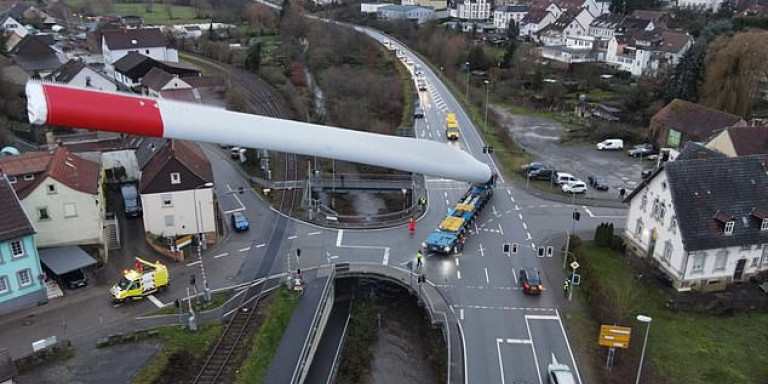 Ο P. Adams Schwertentransporte με έδρα το Λουξεμβούργο μοιράστηκε τις εκπληκτικές φωτογραφίες του πτερυγίου βάρους 25 τόνων, που μεταφέρεται με ελιγμούς μέσα από στενούς επαρχιακούς δρόμους.