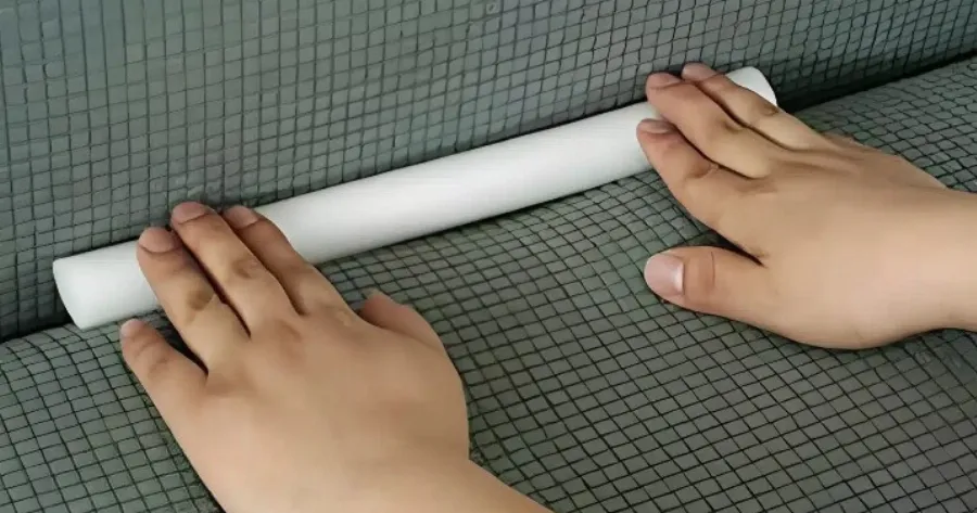 Στρώνετε χαλαρά το ριχτάρι και στην συνέχεια πιέζετε τα ρολά από αφρό μέσα στις γωνίες έτσι ώστε να εισχωρήσουν μέσα και πίσω από το μαξιλάρι του καναπέ το αφρώδες υλικό μαζί με το ριχτάρι.
