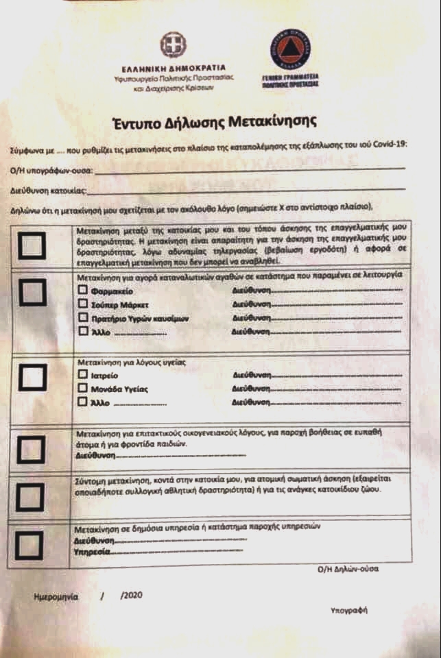 * Σε ΚΑΘΕ ΜΕΤΑΚΙΝΗΣΗ πρέπει οι πολίτες να έχουν μαζί τους την αστυνομική τους ταυτότητα ή διαβατήριο, καθώς και συμπληρωμένο έντυπο βεβαίωσης κίνησης (εκτυπωμένο ή χειρόγραφο) ή το SMS επιβεβαίωσης, για να το επιδείξουν σε περίπτωση ελέγχου.