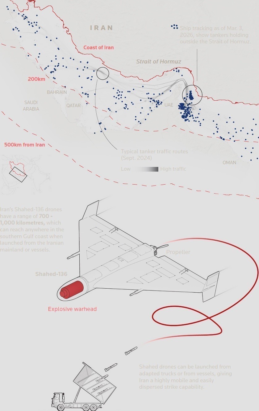 - Οι επιθέσεις ιρανικών drones και πυραύλων θα μπορούσαν να διαταράξουν τη λειτουργία των Στενών του Ορμούζ για μήνες.