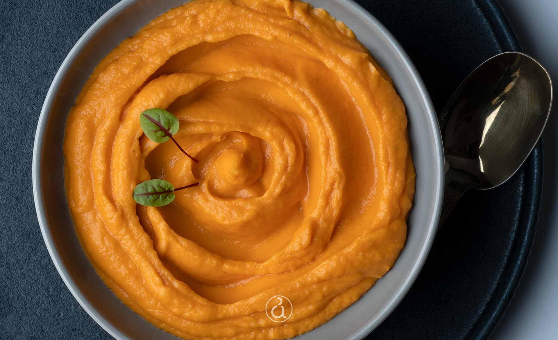 Σερβίρουμε τον πουρέ γαρνίροντας από πάνω με τα φύλλα του φασκόμηλου.