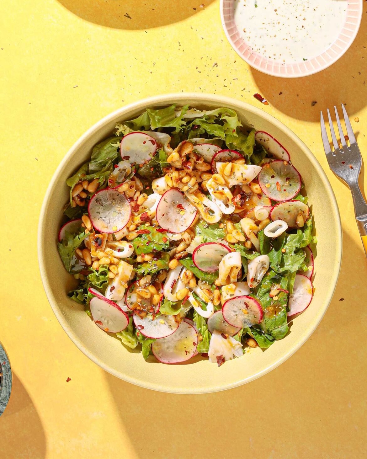 - Σε μια σαλατιέρα ανακατεύουμε τις πρασινάδες με τις ελιές, τις πιπεριές, τα ραπανάκια.