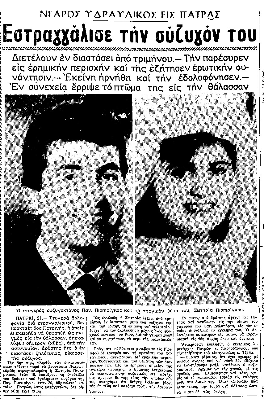 «Την παρακαλούσα θερμά κι εκείνη αρνείτο. Σε μια στιγμή και ενώ καθόμαστε κολλητά κι ακουμπούσε η αριστερή πλάτη στον ώμο της, μου ήρθε σαν τρέλα. Την έριξα κάτω και την έπιασα σφικτά από το λαιμό. Την έσφιγγα, την έσφιγγα όλο και πιο δυνατά. Σπαρταρούσε το σώμα της, προσπαθούσε να μου ξεφύγει. Μα εγώ ήμουν πιο δυνατός. Την είχα πια νικήσει. Σε λίγο το σώμα της παρέλυσε, η ανάσα της σταμάτησε, τα μάτια της γυάλισαν. Ήταν νεκρή. Τότε κατάλαβα τι είχα κάνει. Μετάνιωσα, την έσυρα μέχρι τις καλαμιές όπως κι όπως και την εγκατέλειψα μέσα στη νύχτα. Μετά έτρεχα σαν τρελός».