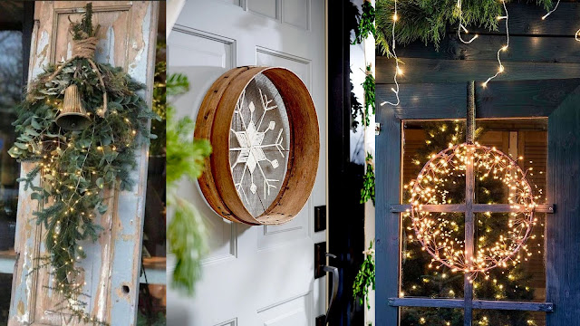 Απλά δέστε μερικά διαφορετικού μήκους πράσινα κλαδιά κωνοφόρων και κρεμάστε τα στην πόρτα, εμπλουτίζοντας αν θέλετε την σύνθεση με κάποια κόκκινα φυσικά στοιχεία, ένα μεγάλο στολίδι ή και μια σειρά led μπαταρίας.