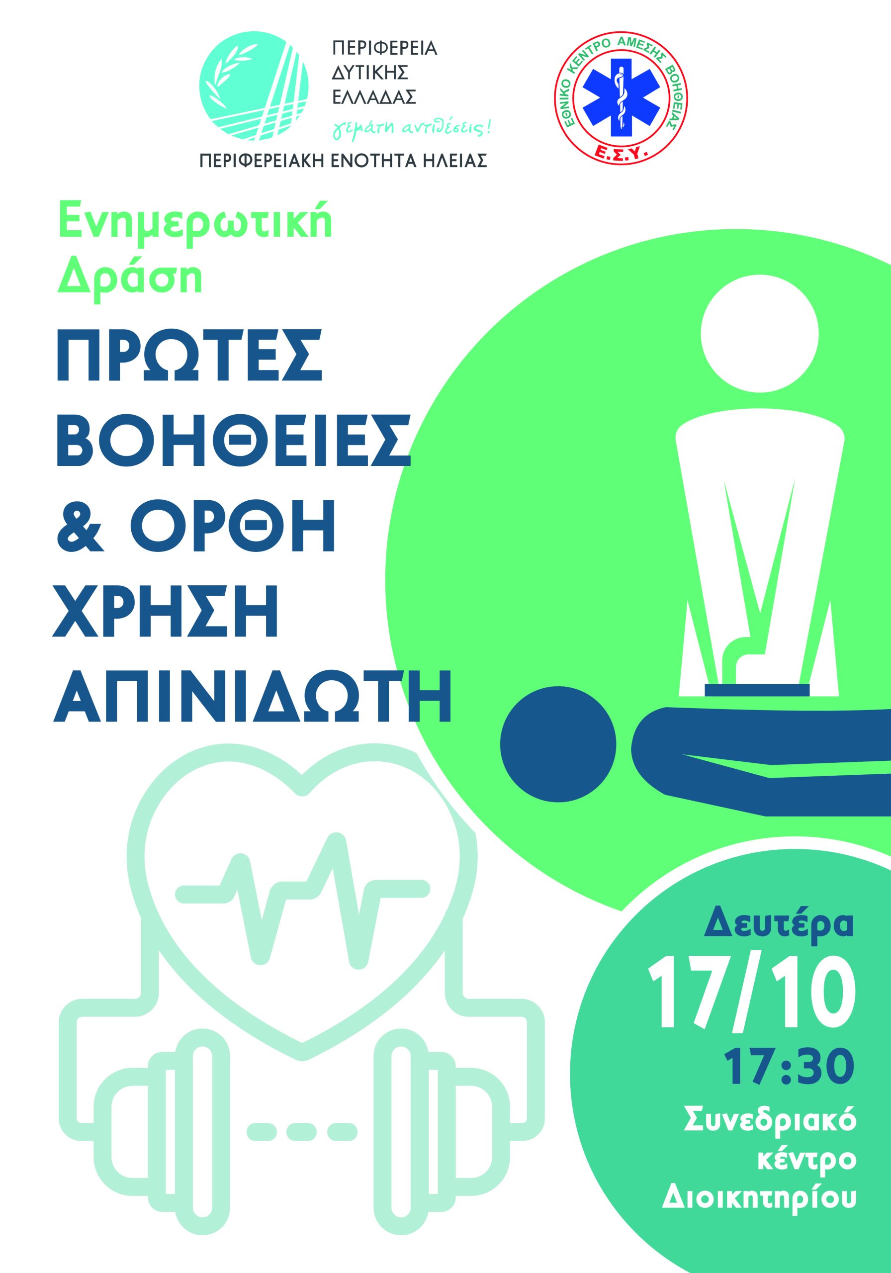 Ενημερωτική δράση με θέμα «Πρώτες Βοήθειες και Ορθή Χρήση Απινιδωτή» διοργανώνει η Περιφερειακή Ενότητα Ηλείας – ΠΔΕ σε συνεργασία με το ΕΚΑΒ, την προσεχή Δευτέρα 17 Οκτωβρίου 2022, στις 5:30 το απόγεμα, στο Συνεδριακό Κέντρο της Περιφερειακής Ενότητας Ηλείας.