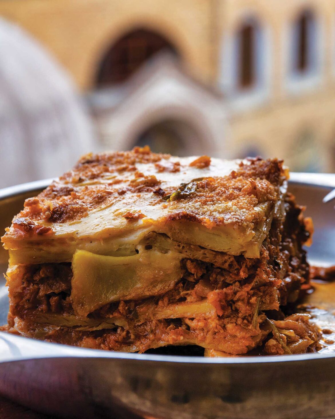 - Πασπαλίζουμε με λίγη φρυγανιά, ραντίζουμε με λίγο ελαιόλαδο, ιδιαίτερα στις γωνίες του ταψιού, και φουρνίζουμε.