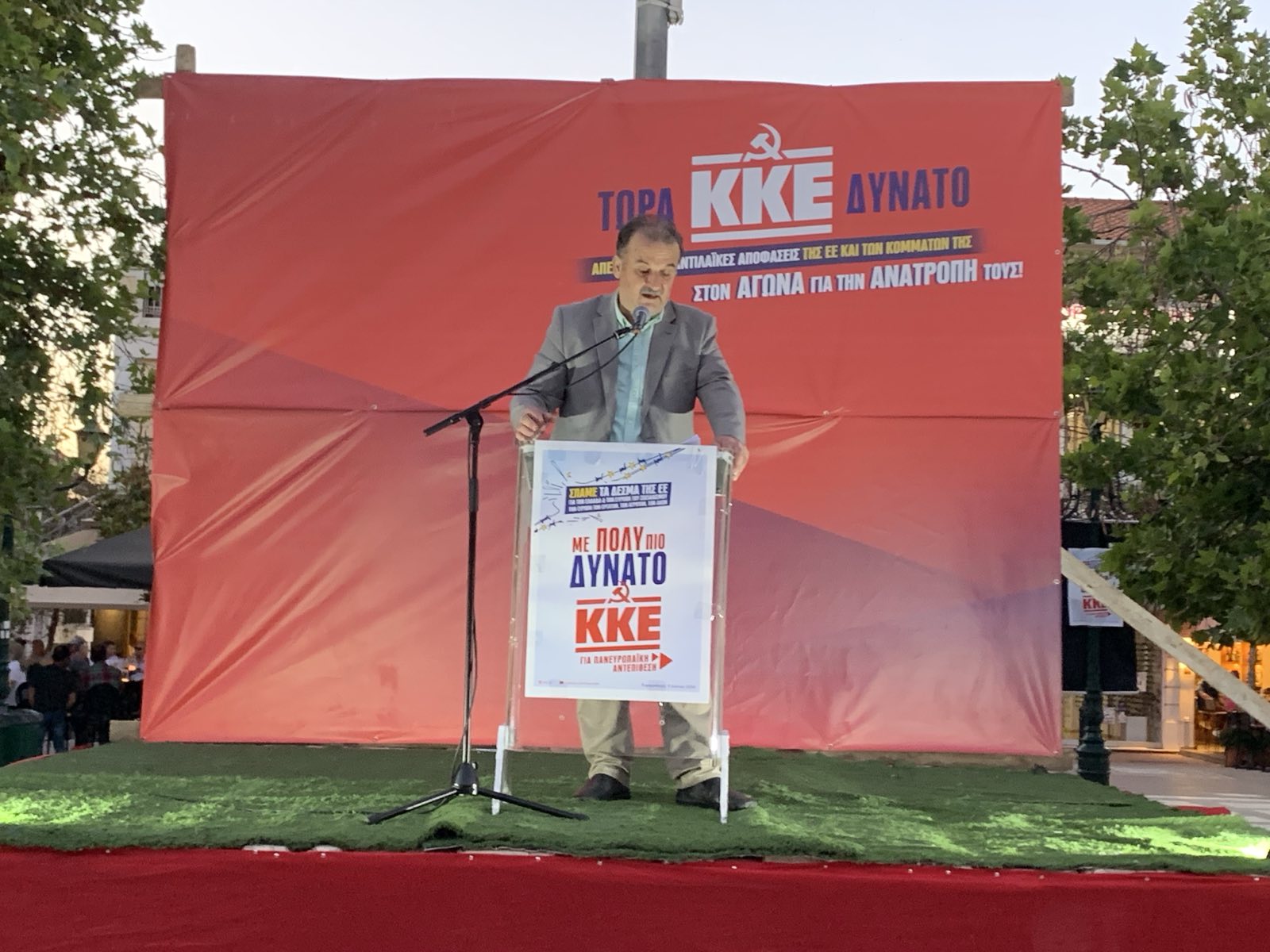 Παρέμβαση πραγματοποίησε και ο Νίκος Παπαδόπουλος, υποψήφιος ευρωβουλευτής του ΚΚΕ, που αφού αναφέρθηκε και εξήγησε τη στρατηγική σύμπλευση των αστικών κομμάτων στο ευρωκοινοβούλιο, μεταξύ άλλων, σημείωσε: “Το δίλημμα που πρέπει να απαντηθεί λοιπόν είναι το εξής, θα τους νομιμοποιήσουμε με την ψήφο μας ώστε να συνεχίσουν το αντιλαϊκό τους έργο ή θα τους βάλουμε φρένο; Για να μην μπορεί ο Μητσοτάκης και ο κάθε Μητσοτάκης από τις 10 του Ιούνη, να μιλάει για ανανέωση της λαϊκής εντολής, όταν θα φέρνει νομοσχέδια που θα τσακίζουν κι άλλο το εισόδημα και τα δικαιώματά μας”.