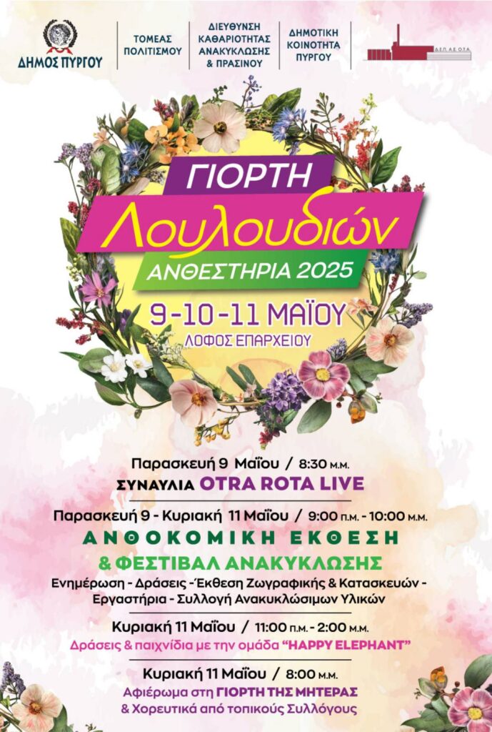 Ο δήμος Πύργου και η Δημοτική Επιχείρηση Πύργου διοργανώνουν τη «Γιορτή των Λουλουδιών», που θα πραγματοποιηθεί στο λόφο του Επαρχείου, το τριήμερο 9, 10 και 11 Μαΐου.