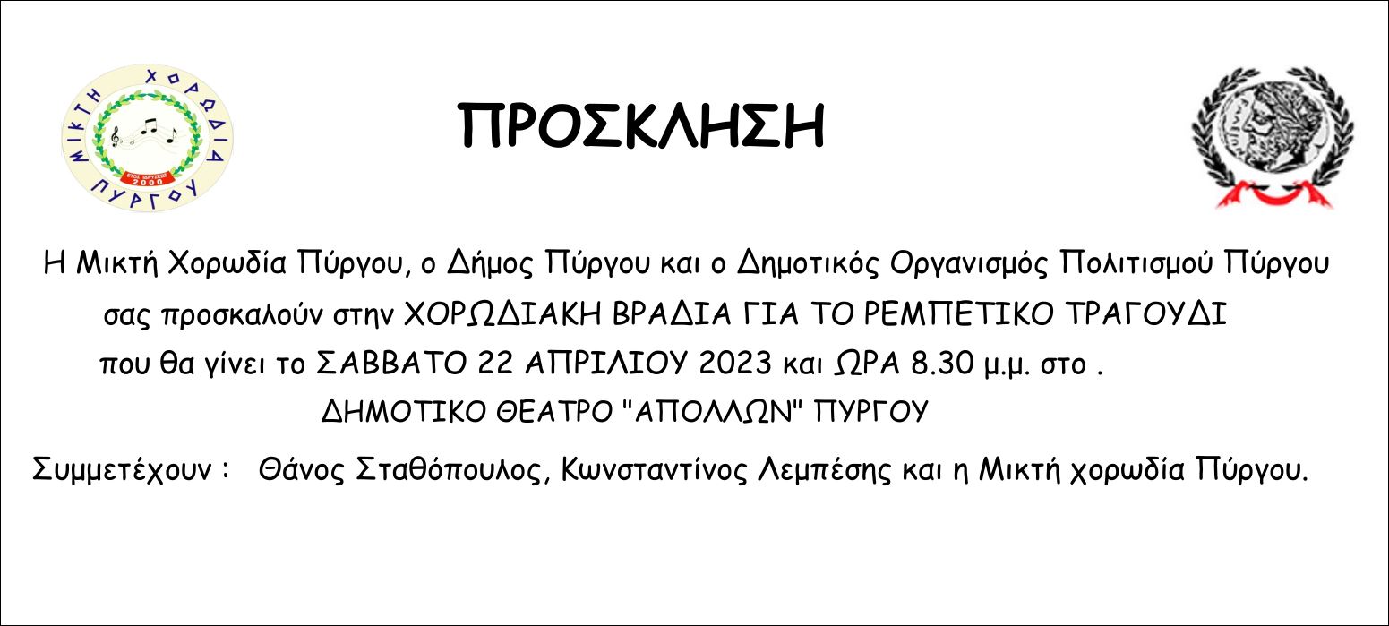 ΠΥΡΓΟΣ: Χορωδιακή βραδιά για το Ρεμπέτικο τραγούδι στο θέατρο “ΑΠΟΛΛΩΝ”