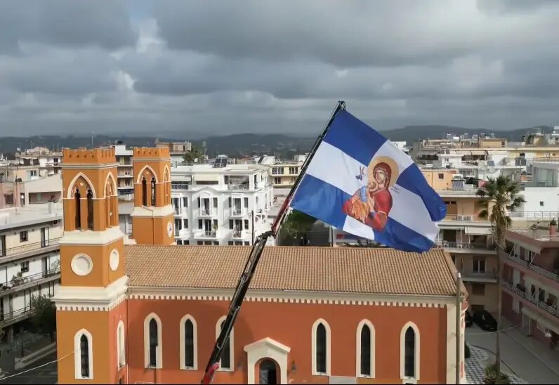 Για ακόμα μια χρονιά η μεγάλων διαστάσεων Ελληνική Σημαία με την εικόνα της Παναγίας Φοβερά Πραστασία κυματίζει περήφανα στο προαύλιο του Ιερού Ναού Αγίας Κυριακής στον Πύργο.