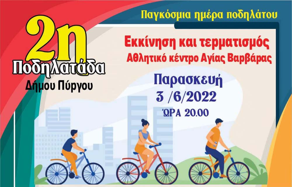Ο Δήμος Πύργου, το τμήμα Παιδείας, το τμήμα Αθλητισμού και το Γραφείο Εθελοντισμού, διοργανώνουν την 2η Ποδηλατάδα, την Παρασκευή 3 Ιουνίου 2022 και ώρα 20.00. Με σημείο εκκίνησης και τερματισμού το Αθλητικό Κέντρο της Αγίας Βαρβάρας, όπου και θα πραγματοποιηθεί συναυλία με το δημοφιλές συγκρότημα Banda Morena μετά το τέλος της διαδρομής.