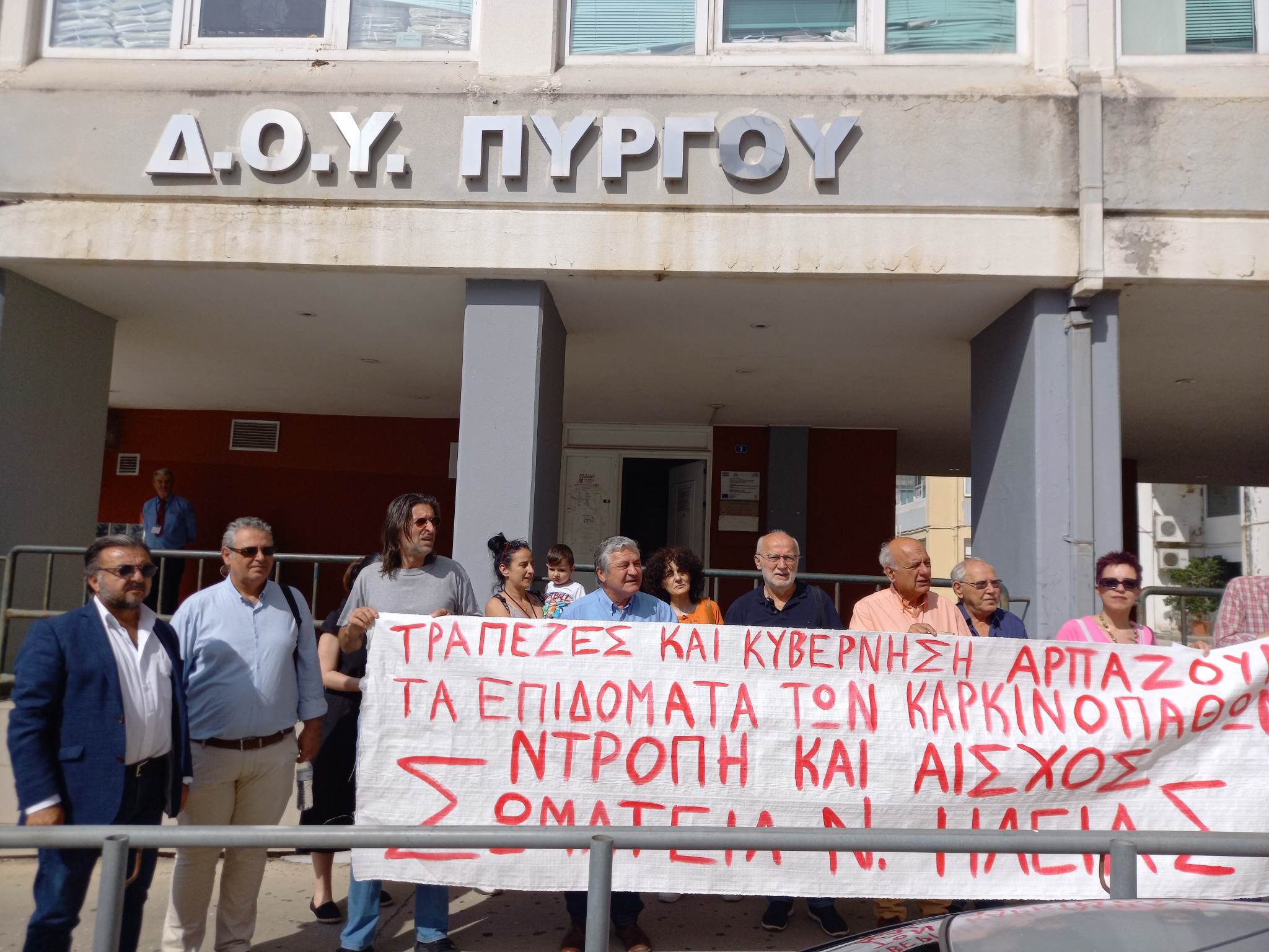 Χτες τα εργατικά και συνταξιουχικά σωματεία του Ν. Ηλείας με την υποστήριξη υποψήφιων βουλευτών και στελεχών του ΚΚΕ έκαναν παρέμβαση στην Εφορία και στην τράπεζα Πειραιώς στον Πύργο, ζητώντας να σταματήσει η κατάσχεση από την Εφορία και η τράπεζα Πειραιώς να επιστρέψει τα παρακρατημένα χρήματα στον 60χρονο καρκινοπαθή και να μην επαναληφτεί στο μέλλον τέτοια απάνθρωπη ενέργεια.