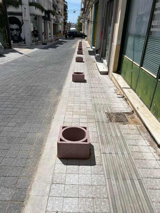 Πριν ακόμα ολοκληρωθεί το έργο με τον φωτισμό και τις ζαρντινιέρες του σε μια προσπάθεια προστασίας από τα παρκαρίσματα των αυτοκινήτων δημότες τοποθέτησαν τσιμεντενια κομμάτια καμινάδας σε ρόλο ζαρντινιέρας.