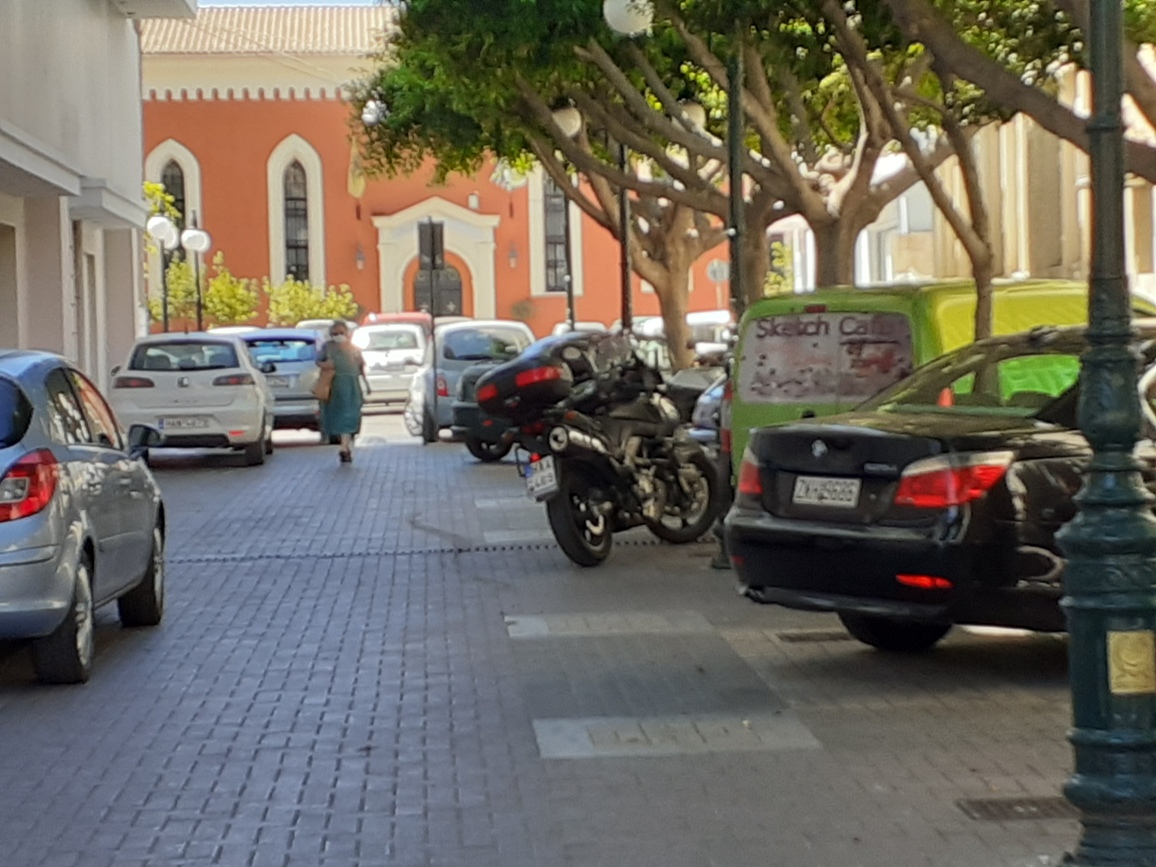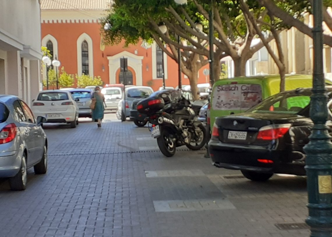 Ο πεζόδρομος από το Επαρχείο έως την παλιά Δημοτική Αγορά γεμάτη από σταθμευμένα (μερικά και σε παρκινγκ διαρκείας) αυτοκίνητα και μηχανάκια.