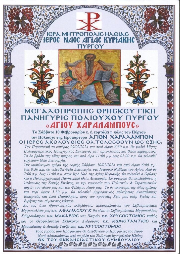 Με λαμπρότητα θα εορταστεί και φέτος ο Πολιούχος Άγιος Χαράλαμπος στον Πύργο.