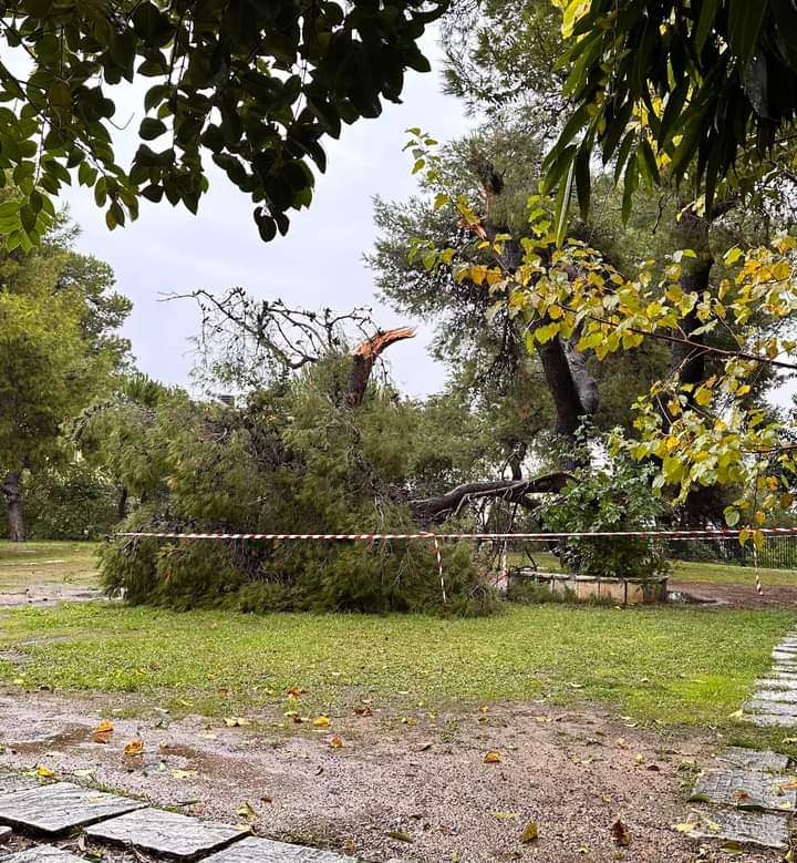 Το πρωί της Δευτέρας στο αλσύλλιο του Επαρχείου στον Πύργο, ένα τεράστιο κλαδί πεύκου αποκολλήθηκε και έπεσε στο έδαφος.