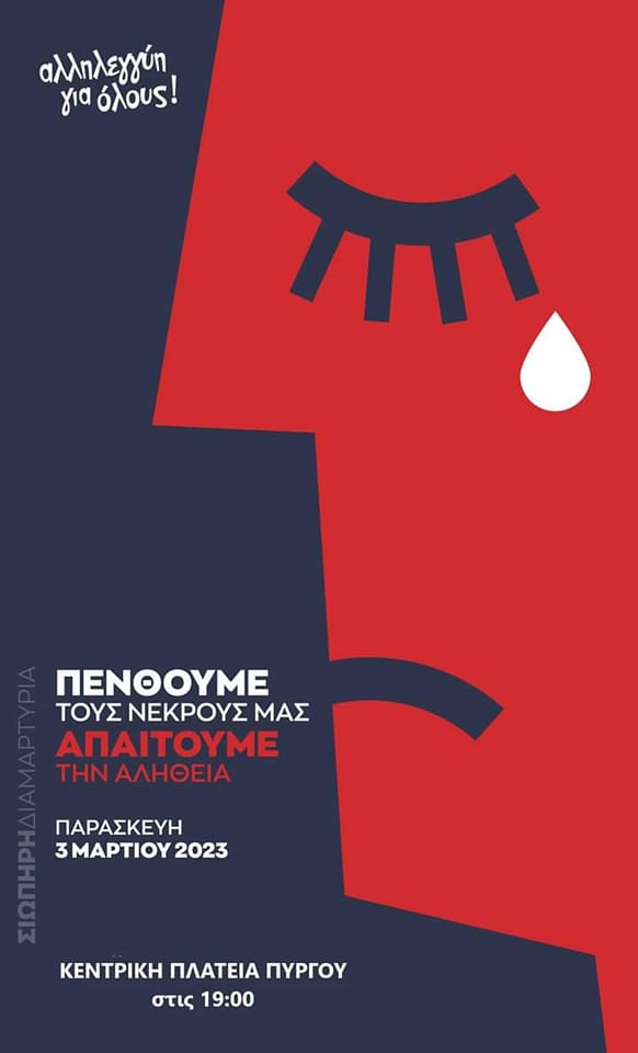 Σιωπηρή διαμαρτυρία θα γίνει απόψε Παρασκευή στην κεντρική πλατεία Πύργου στις 19.00 ως ένδειξη αντίδρασης απέναντι σε όσους έχουν ευθύνες για την τραγωδία των Τεμπών. Το κάλεσμα έχει ξεκινήσει από το διαδίκτυο με σύνθημα ¨Πενθούμε τους νεκρούς μας, απαιτούμε την αλήθεια¨.